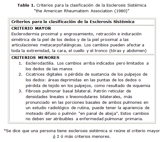 En 1980 fueron publicados los criterios diagnósticos para la enfermedad (ACR 1980) que continúan siendo altamente específicos y sensibles, requiriéndose un criterio mayor o la combinación de dos menores para el diagnóstico. Estos criterios continúan vigentes, sin embargo algunos investigadores y clínicos han postulado la necesidad de incluir signos como el fenómeno de Raynaud o determinados anticuerpos en los criterios diagnósticos. [Tabla 1] Existen otros propuestos por Le Roy y Medsger que aún no han sido validados y difieren de los criterios para ES precoz propuestos por en el grado de compromiso cutáneo.3