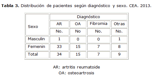 Al estudiar los diagnósticos obtenidos según el sexo de los pacientes encontramos un predominio marcado de artritis reumatoidea para las mujeres en un 97.06 % y la osteoartrosis y la fibromialgia en un 100% para el mismo sexo, correspondiendo solo para el sexo masculino en otros diagnósticos un paciente con artritis gotosa de larga data y otros 8 casos con diagnóstico de condrocalcinosis que resultaron del sexo femenino. En algunos estudios consultados la osteoartrosis presenta similar frecuencia en mujeres y hombres y en estas aparece en edades más tempranas, lo cual no guarda relación con nuestra muestra.11