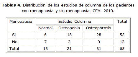 Se observó un predominio de la osteoporosis en columna sobre la osteopenia en el 53.8 % de las pacientes que presentaban menopausia.