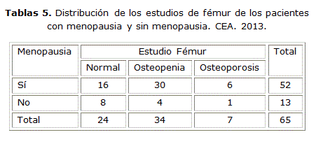Con respecto al estudio del fémur se evidenció la osteopenia sobre la osteoporosis en un 57.7 % en las pacientes menopaúsicas y en un 53 % del total de las mismas. [Tabla 6]