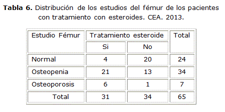 El 67.7 % de los pacientes que llevaban tratamiento esteroideo presentó osteopenia en el estudio del fémur sobre el 9.2 % que presentaron osteoporosis, resultando normal solo en el 6.1% de los pacientes. [Tabla 7]