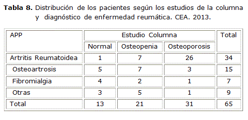 Se observó un predominio de la osteoporosis en columna sobre la osteopenia en las pacientes que presentaban menopausia; el sexo femenino y los déficit hormonales que establece el climaterio y la menopausia influyen negativamente en la calidad de la masa ósea siendo un factor agravante para las pacientes reumáticas el déficit estrogénico, por su parte entre los hombres con artritis reumatoide la caída de los niveles hormonales de testosterona puede ser uno de los mecanismos responsables de disminución de la masa ósea.12,13