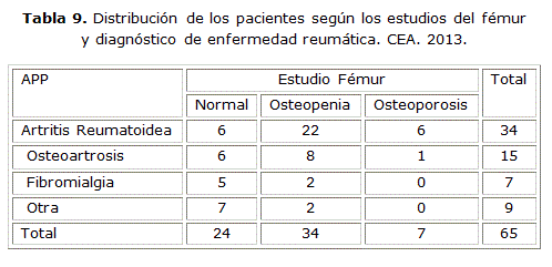 En el estudio del fémur primó la osteopenia sobre la osteoporosis en el 52.3 % de los casos la cual es más frecuente en la artritis reumatoide para el 64.7 % de los pacientes.