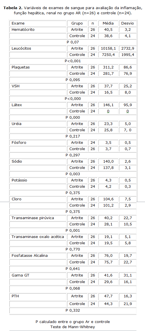 Os resultados demonstram aumentos significativos dos leucócitos, Fator Reumatóide, hemossedimentação das hemácias, da transaminase pirúvica, e tendência a aumento da gama glutamiltranspeptidase, no grupo AR. Também foram encontradas diferenças com aumento dos níveis de sódio e cloro nesses grupos em relação aos controles. Tabela 2