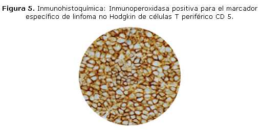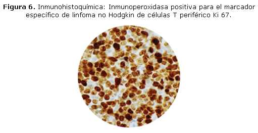 Biopsia de ganglio cervical 16B-1726: Linfoma no Hodgkin de células T patrón periférico. Inmunohistoquímica: CD3+, CD20+ población residual, CD5+, CD4+, CD21+, CD79a+ población residual, CD15 negativo, CD30 negativo, CD43 positivo focal, Ki67 positivo en más del 40 % de las células tumorales, CD34 negativo. (Figura 4, Figura 5, Figura 6)