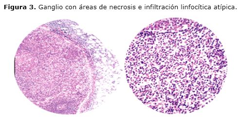 En algunos casos es difícil distinguir a los enfermos que tienen un proceso reactivo de los que padecen un verdadero linfoma.6,12-15 Aunque la necrosis ganglionar es mucho más frecuente en enfermedades infecciosas reactivas, y frecuentemente se asocia a patrones predominantemente foliculares, paracorticales o granulomatosos, cuando es tan extensa sin identificar proceso infeccioso con empeoramiento clínico progresivo, hay que sospechar la presencia de linfomas, para lo cual es necesaria una correlación clínico-patológica adecuada.16