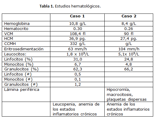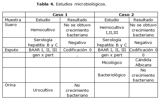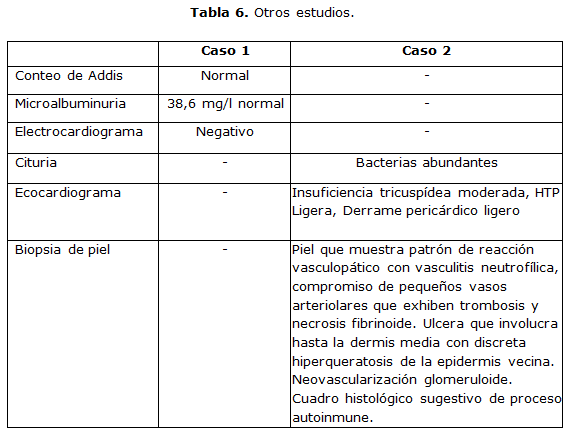 Química sanguínea normal al igual que la función hepática, [Tabla 2] alterada la función renal con creatinina en 137.6, microalbuminuria de 38.6 mcg / L. Reactantes de fase aguda alterados, LDH 448; proteína C reactiva positiva, cituria con leucocituria, microalbuminuria, hematíes por sépsis en la orina con cultivos negativos.