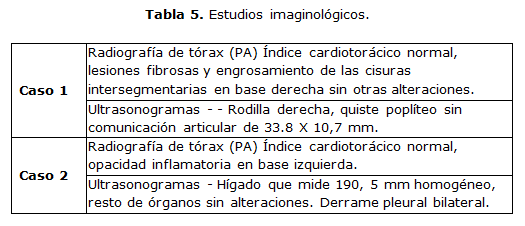 Exámenes de Tórax negativo, radiología de rodillas negativas. Ultrasonografía con elementos de sinovitis crónica y quiste poplíteo. [Tabla 5]