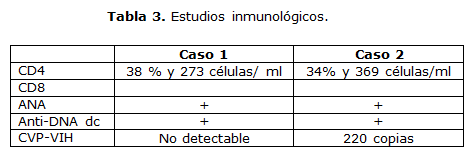 La paciente 2, hizo un severo debut del lupus luego de varios años con el VIH. Clínicamente desarrolló un síndrome febril prolongado, toma del estado general, lesiones vasculíticas de miembros inferiores y ulceradas en el tercio medio e inferior de la pierna derecha de difícil curación y a todo ello se sumó una severa escabiosis. Todo ello en el contexto de tratamiento ARV, e inesperadamente, con un conteo normal de células T CD4, y carga viral no detectable. De cualquier forma resulta muy interesante que haya dos pacientes que cuenten con esta asociación patológica en nuestra larga casuística. En la era pre-HAART, informamos de un caso que mantenía criterios clínicos para lupus like.(21)